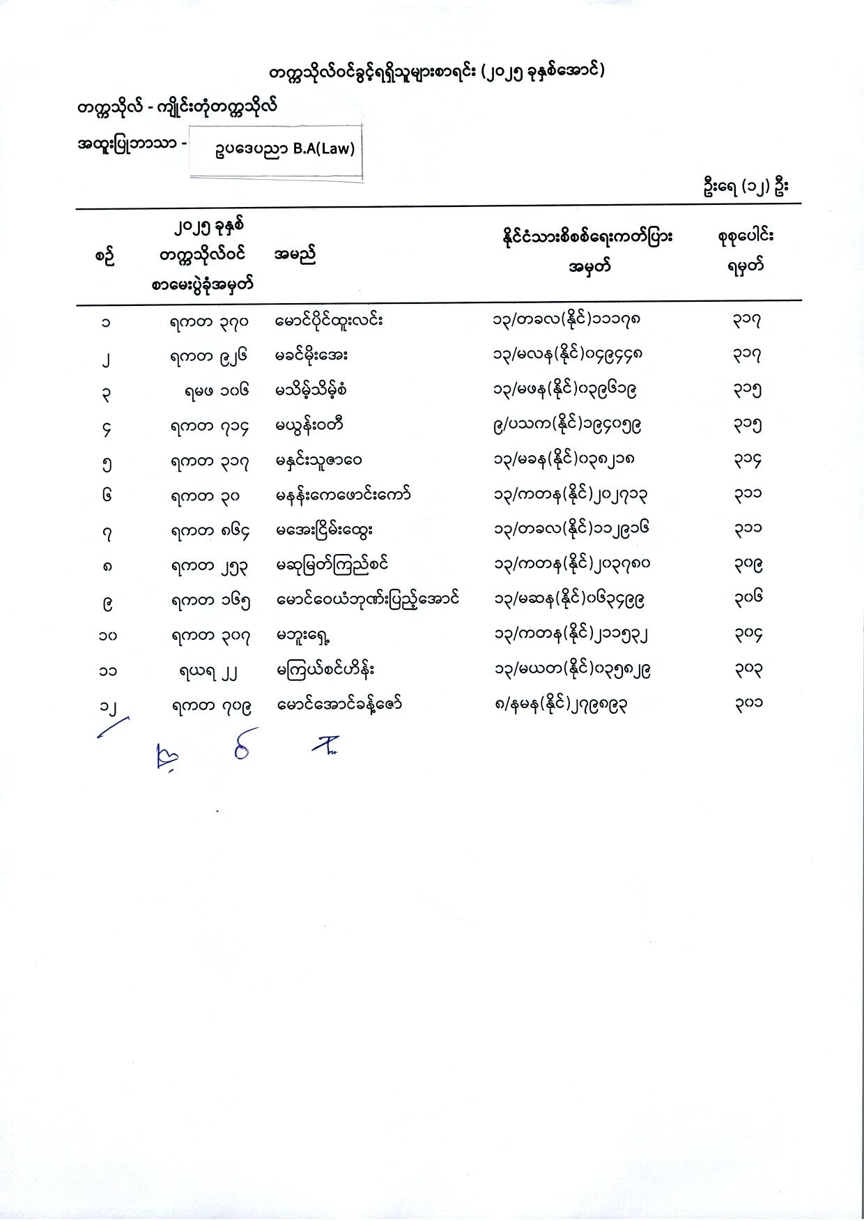 (၇) ဥပဒေပညာ B.A(Law)